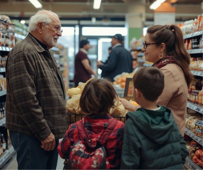 I’m helping ring up when an old man (OM) comes up with a cart full of stuff. He graciously reminds me of his senior discount. I’m ringing him up. We get into some small talk while I’m ringing him up. I notice a line forming so I call for back up. When I’m almost done with OM the next customer in line is a mom with 3 kids. One is a newborn the other 2 are boys appearing to be 4 and 6. The kids are carrying most of the food. My co worker calls next in line and the mom and kids pass by OM. OM comments what a cute baby. I finish ringing up OM and he moves to the side to check his receipt. He comments to the 2 boys that they are being good big brothers.