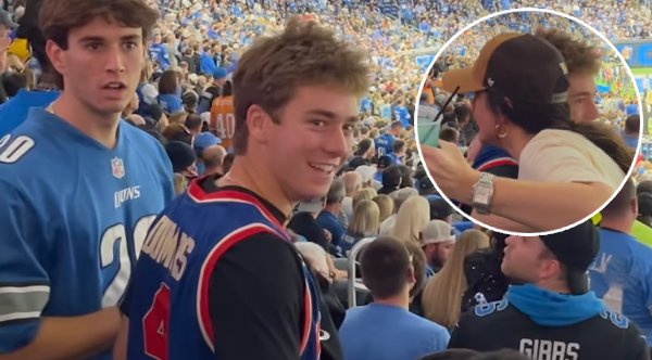 Woman surprises Detroit fan wearing basketball jersey with a football jersey of his favorite player.