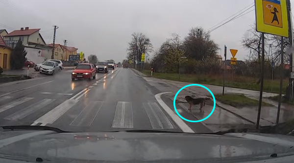 A dog in Poland waits patiently for traffic to stop and then uses the crosswalk to walk across the busy road.