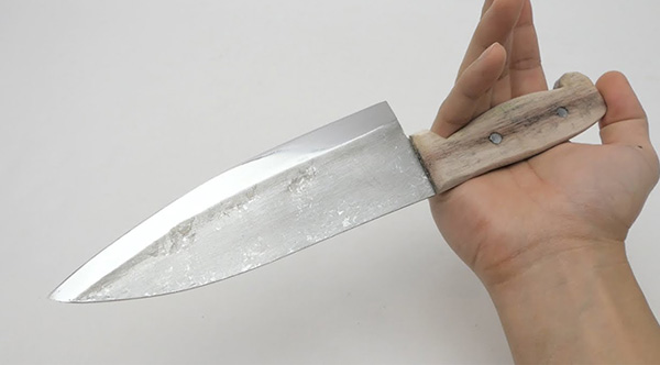 A Japanese man uses a roll of cheap aluminum foil from the grocery store and makes a solid kitchen knife by applying heat.