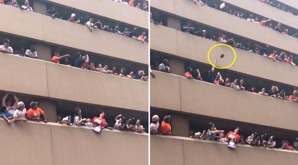 During the parade celebrating the Houston Astros winning their first World Series, a woman dropped her hat which fell many stories. Watch how Astro fans work together to get it back to her.