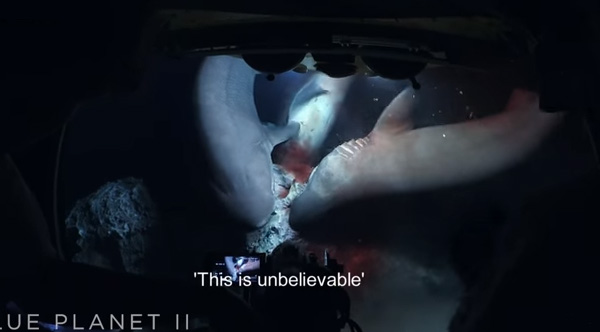 The Blue Planet II team dive to over 700 meters to see what happens to a whale carcass on the seabed. While filming sharks as they feast, the sharks start to take a worrying interest in the submarine.
