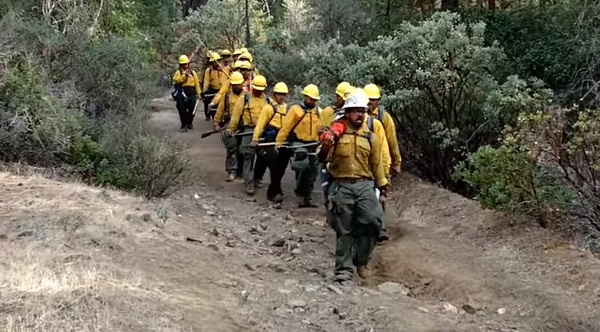 Samoan hotshots, or forest firefighters, march down the mountain after a hard days work while singing a beautiful, uplifting song.