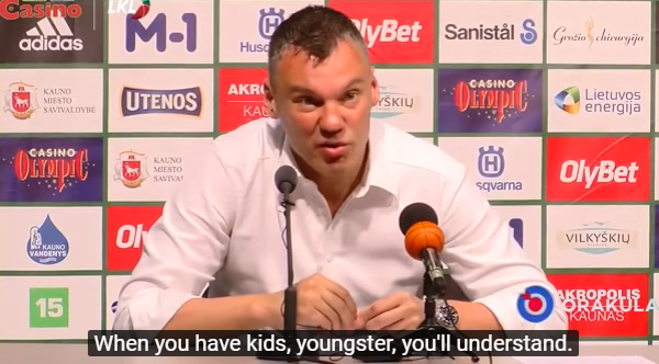 Coach Sarunas Jasikevicius of a Lithuanian basketball league addresses a question in a press conference about the absence of one of his star players, Augusto Lima, who wasn't present due to the birth of his child.