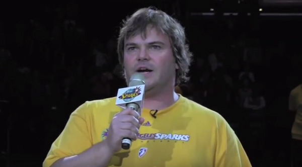 Jack Black sings the national anthem in Los Angeles before a Sparks game.