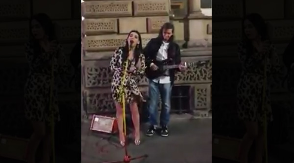 Girl on a night out in Yorkshire, UK, shows a busker how amazing her voice is.