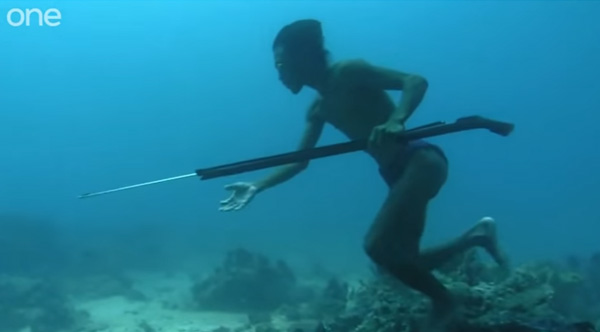 On one breath, this man descends 20 meters (65 feet) to the ocean floor to hunt for fish.