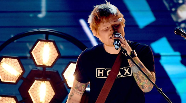 One-man-band Ed Sheeran performs 'Shape Of You' at the 59th GRAMMY Awards.