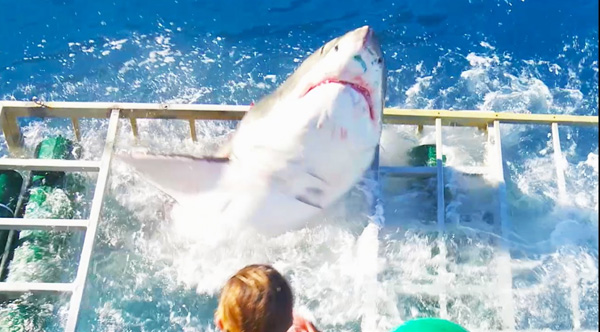 On a recent great white shark cage diving trip we experienced a very rare event, a shark breaching the side of the cage.