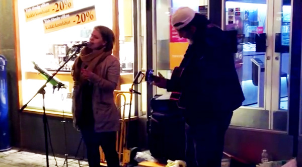 This woman with an amazing voice joins a street performer to sing Hallelujah.