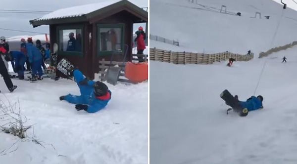 Guy Can't Stop Laughing At His Friends' First Time Snowboarding