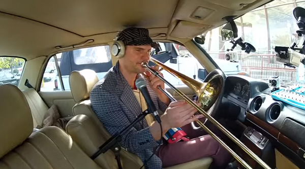 A German guy in his car performs Macklemore's 'Thrift Shop' using a trombone, accordion, and looping machine.