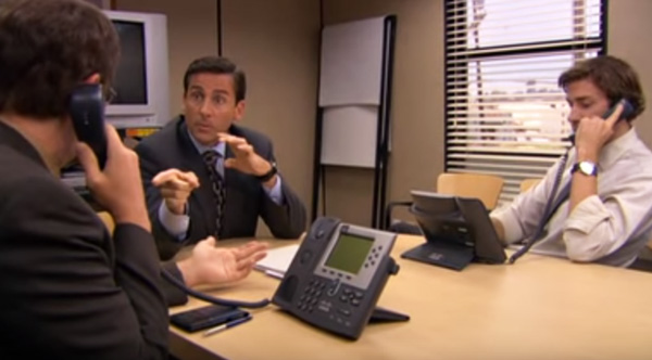 Micheal micromanages his employees Dwight and Jim and asks Dwight to sell paper to Jim, aka Bill Buttlicker, over the phone.