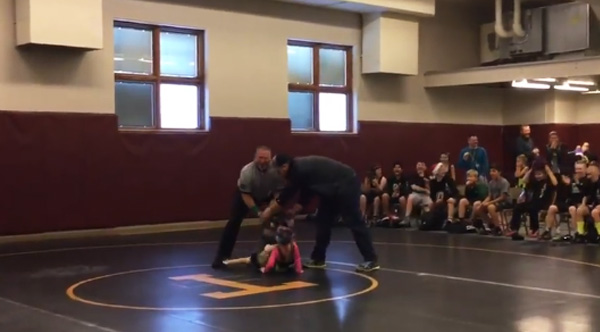 A little boy who was at his sister's wrestling match has stolen the show after his protective instincts kicked in and he decided to act.