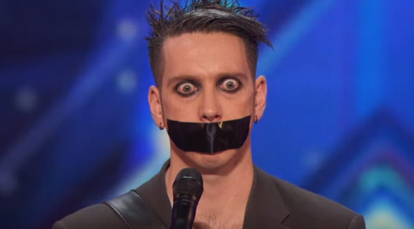 He walks onto the America's Got Talent stage with tape over his mouth, unable to introduce himself or give any answers. Then the music starts and he pulls out a pair of oven mits...