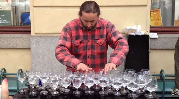 A street musician in Prague uses glasses filled with water to make beautiful music.