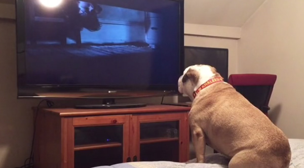 Khaleesi, a 4-year-old English Bulldog, loves watching horror movies and always tries to protect the victims.