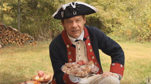Using a typical 18th century soldier ration, he cooks three meals - a soup, a stew, and a hash.
