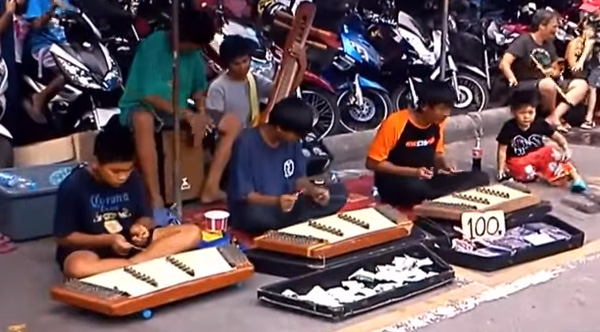 A group of young street performers in Thailand play 'I Will Survive' and Linkin Park's 'Numb' on khims.