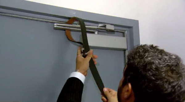 He Tightens His Belt Around The Door Hinge. This Could Save Your Life