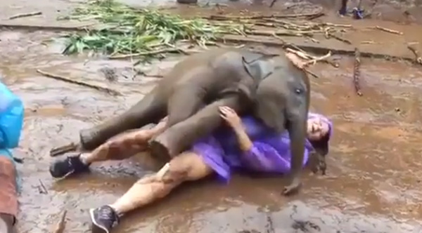 Happy Baby Elephant Rolls Around With Woman In The Mud