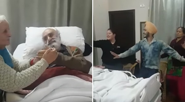 A family cheers up their critically ill grandfather by dancing for him by his bedside in the hospital.