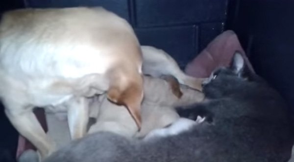 Stray Momma Cat Looking For Shelter Finds A Home With A Momma Dog And Her Puppies