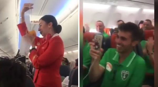 Flight Attendant Can Barely Get Through Her Safety Instructions Due To Hilarious Soccer Fans
