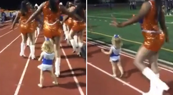 A two-year-old girl stole the show at Southwood High School's homecoming football game when she joined the dance team during the marching band's halftime performance.