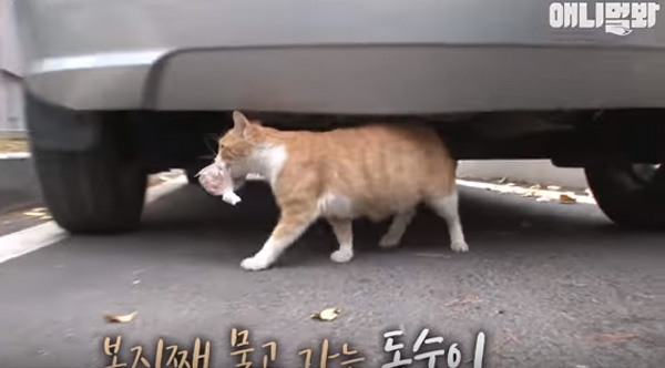 A Korean woman who feeds many stray cats noticed that one of her regulars would not eat unless the food was set out in a bag. The cat would only show interest in the food if she could take it with her.