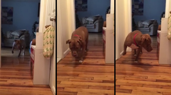 A hilarious video of a pit bull scared to walk down the hallway because the cat's behind the door.