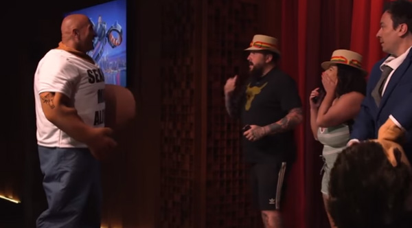 Dwayne Johnson and Jimmy Fallon wear mascot versions of themselves, and surprise fans at Universal Studios.