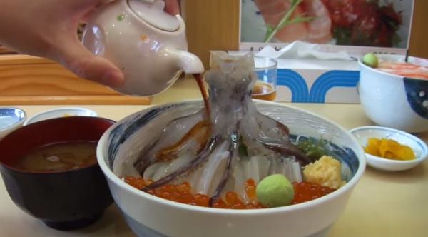 The sodium chloride in soy sauce sends a response to the dead squid's muscle cells. This is the result.