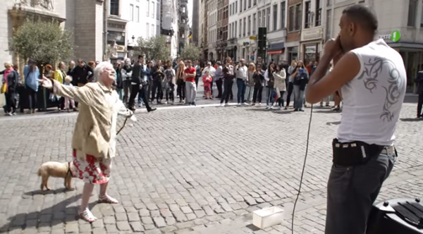 This Old Lady Walking Her Dog Stops In Front Of A Street Performer And Totally Steals The Show