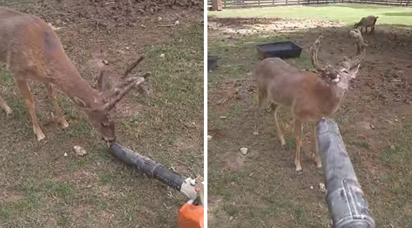 This Deer Is Intrigued By The Leaf Blower. Then He Turns It On...