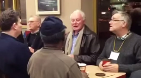 This older male acapella group serenades customers at a Tim Hortons restaurant with some beautiful harmonies.