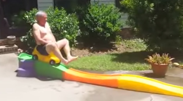 A man rides a toy car off a track and into a pool with a priceless ending.