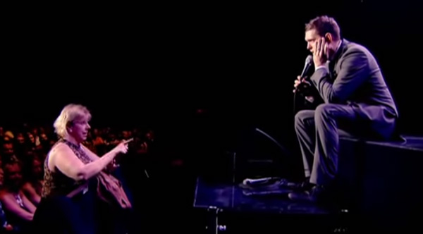 When Mom embarrasses you in front of thousands of people, you better deliver. Michael Buble's reaction is priceless.