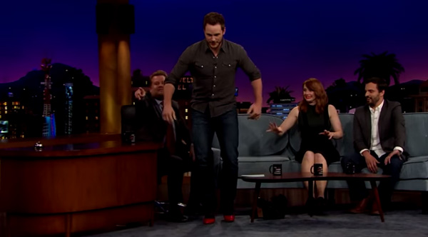 Chris Pratt demonstrates the proper way to run from danger in a pair of high heels.