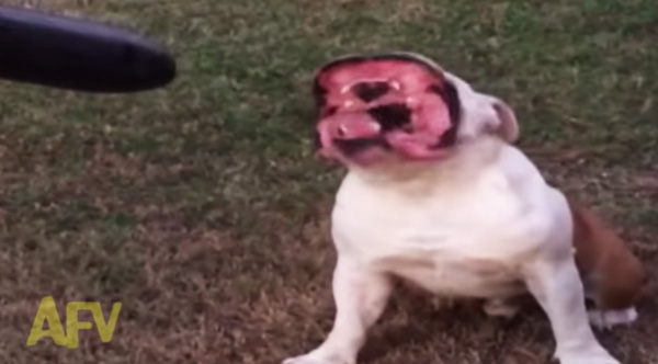 A happy bulldog gets his face turned inside out trying to catch the wind from a leaf blower.