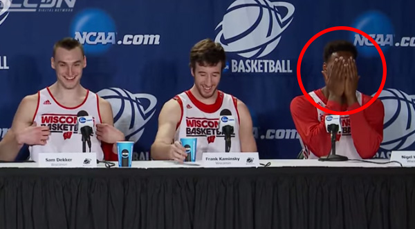 A Wisconsin basketball player has an embarrassing moment during a press conference. His reaction is priceless!