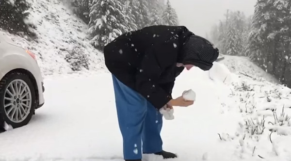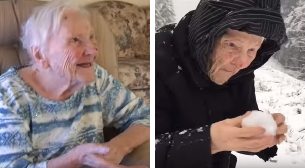 Armand Foisy was traveling with his 101 year-old mother in the snow and had stopped the car to turn around. But before he got going, her car door flew open and out she stepped into the snow. Thankfully, he captured this on film!
