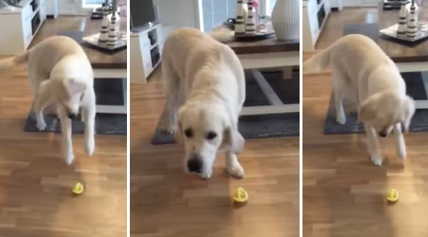 And here we see the eternal fight between the sour taste of lemon and the Golden's desire to eat absolutely everything in its path.