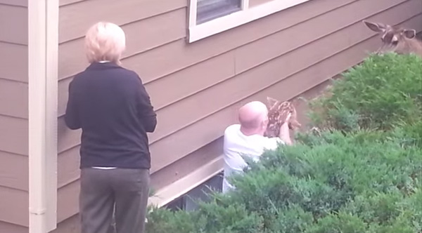 A tiny fawn fell into a window well and couldn't get out. After a brief panic, it stopped running around in the well and let him hand it out to its concerned mother.
