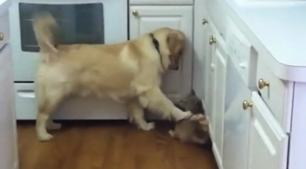 An adorable video of a golden retriever trying his hardest to get the cat to play with him.