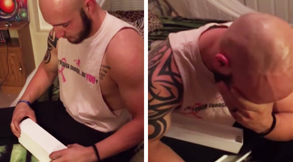 His wife surprises him on his birthday with what he thinks is an Apple Watch. When he opens the box to find her pregnancy test inside, he breaks down in tears of happiness.