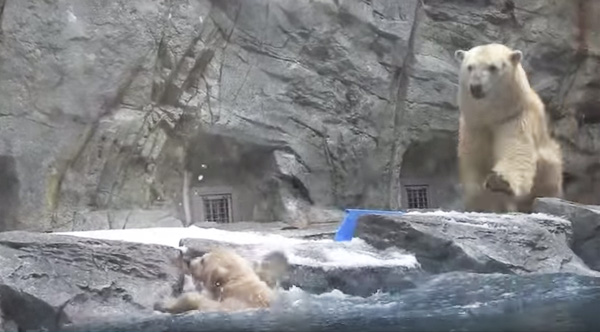 When this cub falls into deep water, Mom immediately dives in to save her.