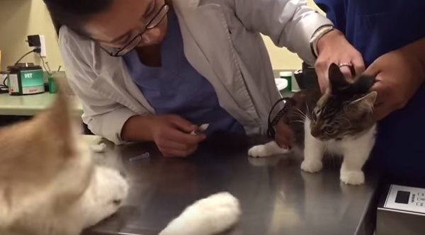 Cuteness overload! Husky comforts a scared little kitten that's getting shots at the vet.