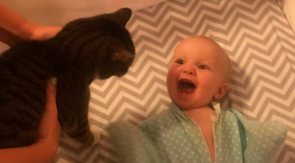 They weren't sure how the baby would react to the cat, but she was thrilled!