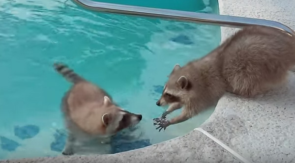 Two Raccoons Find A Pool - One Tries Swimming And The Other Tries To Save Him